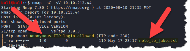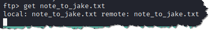 3. Looking at the nmap results, FTP is left open to anonymous login, and we can see that a file called note_to_jake.txt is accessible