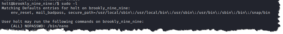 18. Type sudo -l to check what sudo privileges does user holt has