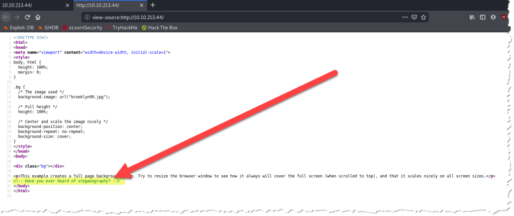- The page source above is telling us to try steganography. What is steganography? This is the practice of concealing a file, message, image, or video within another file, message, image, or video1.