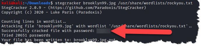 - Now, let’s try to see if stegcracker can find any passwords. stegcracker brooklyn99.jp /usr/share/wordlists/rockyou.txt