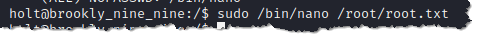 - That means we have root access when using /bin/nano. We will access the root folder and the root flag through nano. Type sudo /bin/nano /root/root.txt