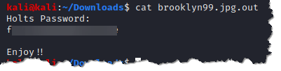 - Now, let’s check the content of the file brooklyn99.jpg.out and see if there is any helpful information hidden through steganography. cat brooklyn99.jpg.out