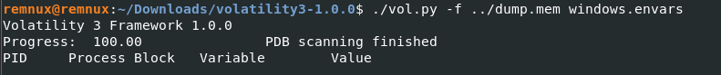 - Type the command: ./vol.py -f location_of_the_dumped_memory_file windows.envars