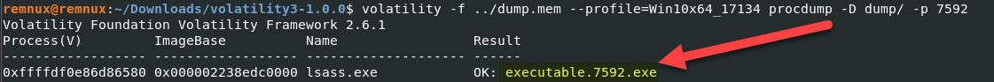 - Using Volatility 2, type the command: volatility -f location_of_the_dumped_memory_file –profile=Win10x64_17134 procdump -D dump/ -p 7592
