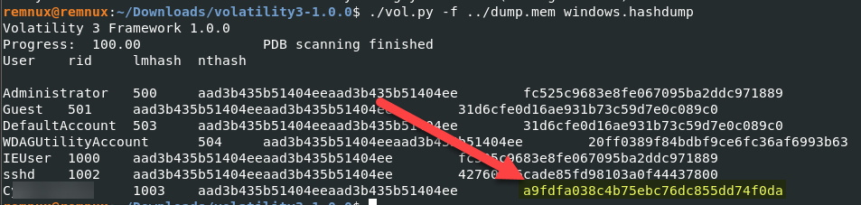 - Type the command: ./vol.py -f location_of_the_dumped_memory_file windows.hashdump