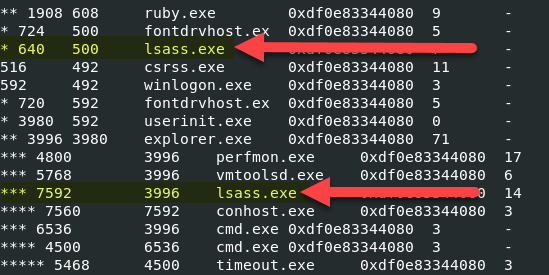 - You will see on the image below, there are two lsass.exe processes. The top one has a parent PID of 500 which is a legitimate parent process for lsass.exe. The second entry is showing Explorer.exe as its parent PID, which makes it suspicious.