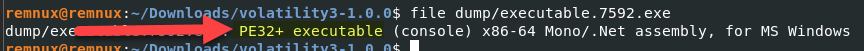 - And when you do file dumpo/executable.7592.exe, the result shows that this is a PE file.