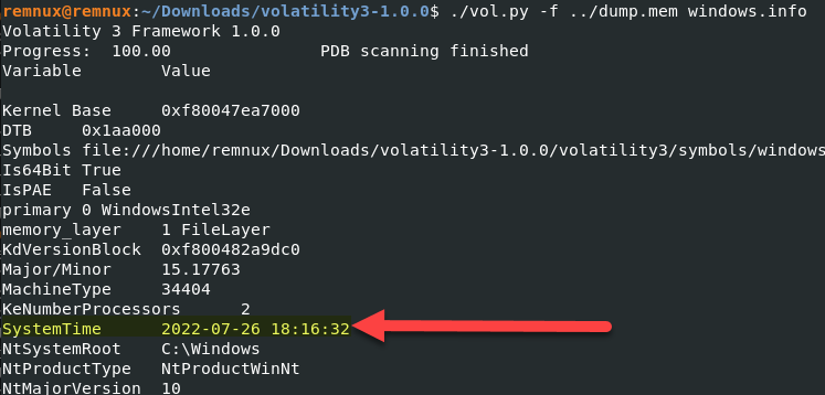 - Type the command: ./vol.py -f location_of_the_dumped_memory_file windows.info
