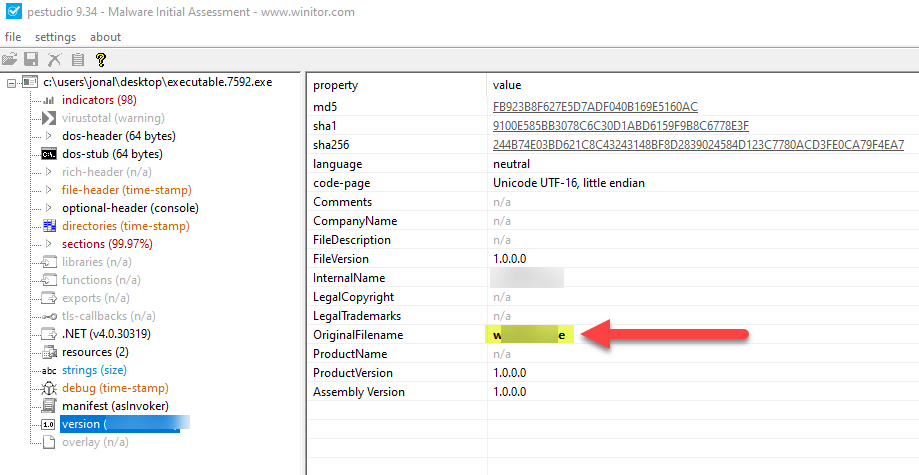 - Open up PEStudio, and load executable.7592.exe, we will see what is the tool name.